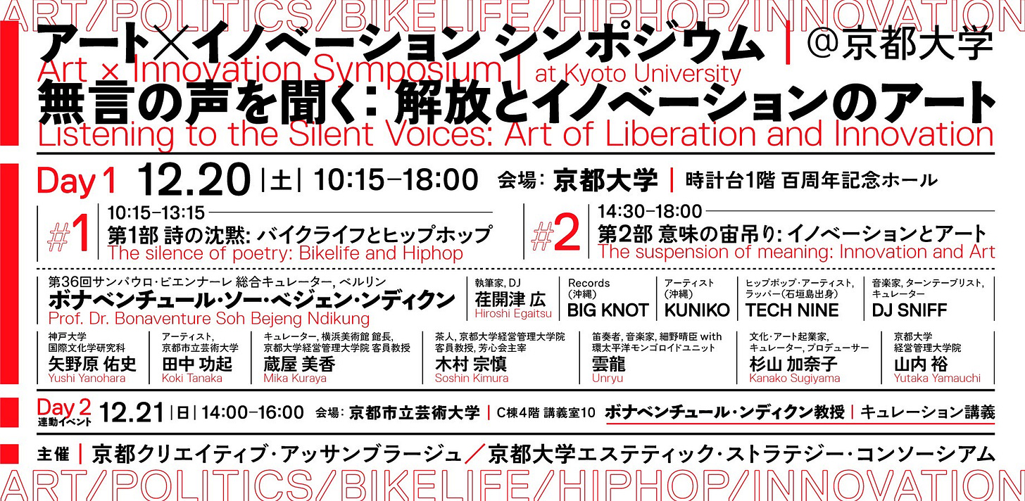ベルリンから、第36回サンパウロ・ビエンナーレ・総合キュレーターのボナベンチュール・ソー・べジェン・ンディクン博士(Prof. Dr. Bonaventure Soh Bejeng Ndikung)を迎えて、アートとイノベーションのシンポジウムを行います。ヒップホップアーティスト、DJ、笛奏者、現代アーティスト、茶人まで、多様なゲストと、時の流れを止め、アート、政治、イノベーションについて考えたいと思います。